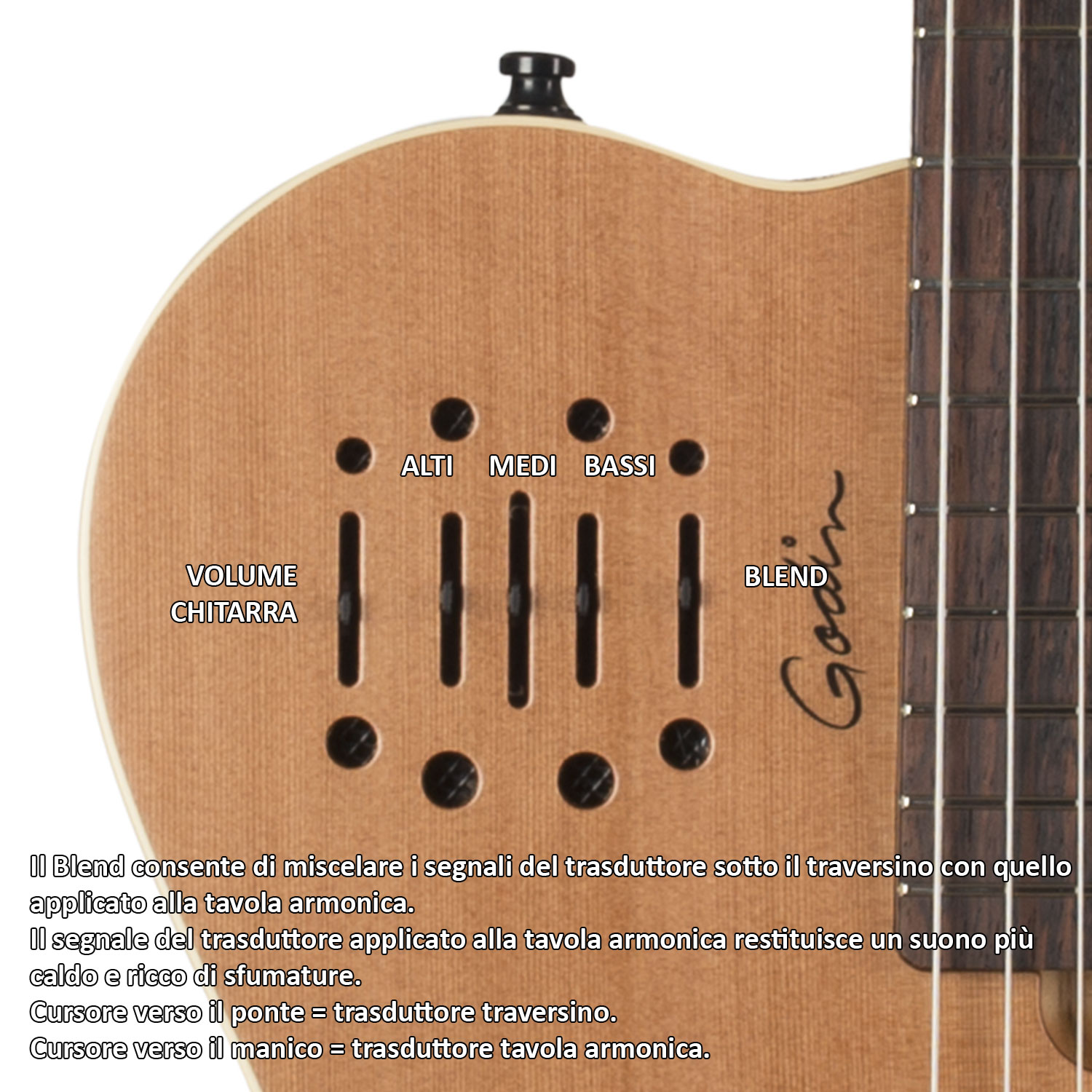 MULTIAC GRAND CONCERT ENCORE SG - Chitarra elettrica con corde in nylon - Serie Multiac - Made in Canada - Lunghezza scala: 25,66" (651,76mm) - Struttura: bolt-on - Corpo: parte centrale in acero e lati in tiglio - Top: cedro massello - Manico: mogano con finitura satinata - Tastiera: palissandro - Radius: 24" - 19 tasti Medium - Capotasto: Tusq 2,0" (50,80mm) - Binding fasce: bianco - Controlli: 1x Volume + 1x Treble + 1x Mid + 1x Bass +1x Blend - Ponte: palissandro con trasduttore sotto il traversino - Trasduttore soundboard aggiuntivo - Meccaniche: Godin 16:1 cromate con chiavette bianche - Colore: Natural - Finitura: semi-lucida - Borsa imbottita Godin inclusa.