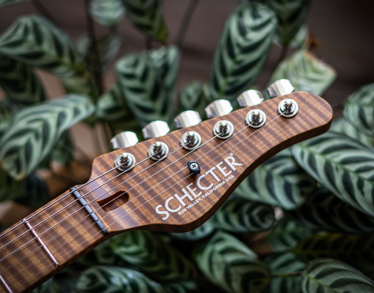 Schecter USA realizza anche tutto l’hardware: ponti (fissi e tremolo) con sellette in acciaio fresato e meccaniche autobloccanti, architetture invisibili che tengono insieme l’universo emotivo e materico dello strumento.