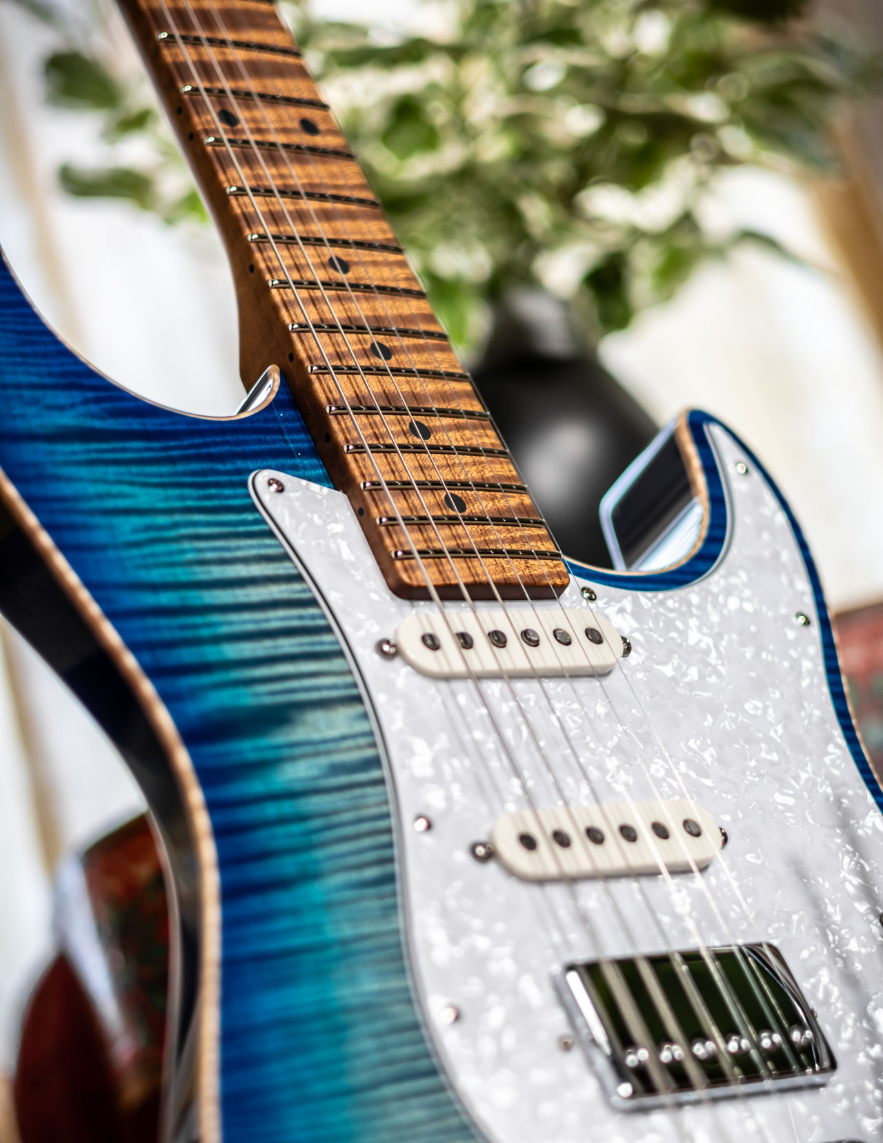 Ogni pezzo di ontano "Reserve Selection" attentamente intervistato, ogni venatura dell'acero fiammato studiata come un testo sacro. Il processo di “roasting” di manico e tastiera si trasforma in un rituale di iniziazione che eleva la materia al confine tra scienza e magia. E quando le dita incontrano questo legno nobile, stabiliscono una connessione telepatica ed emotiva con un essere senziente.